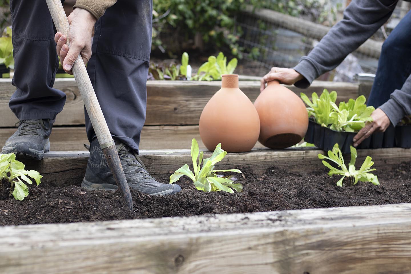 Ollas conserve water 50-70% over hand watering. They reduce frequency of watering, evaporation, and runoff. They also reduce weeds.
