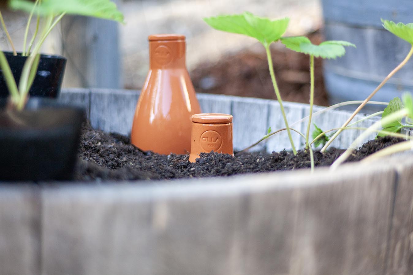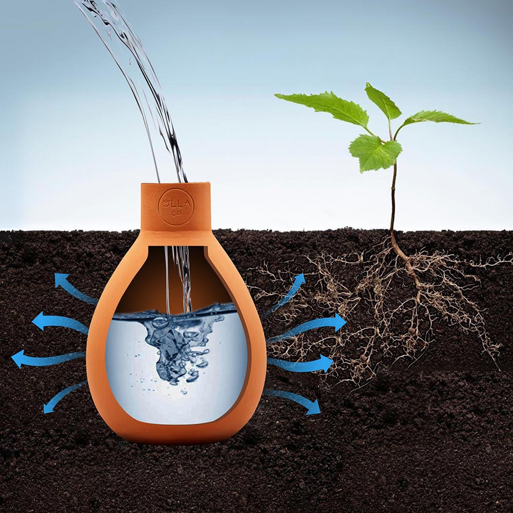 An Olla (OY-yah) is a porous terra cotta water vessel that, when buried in soil and filled with water, allows the roots of plants to draw out the exact amount of water they need.